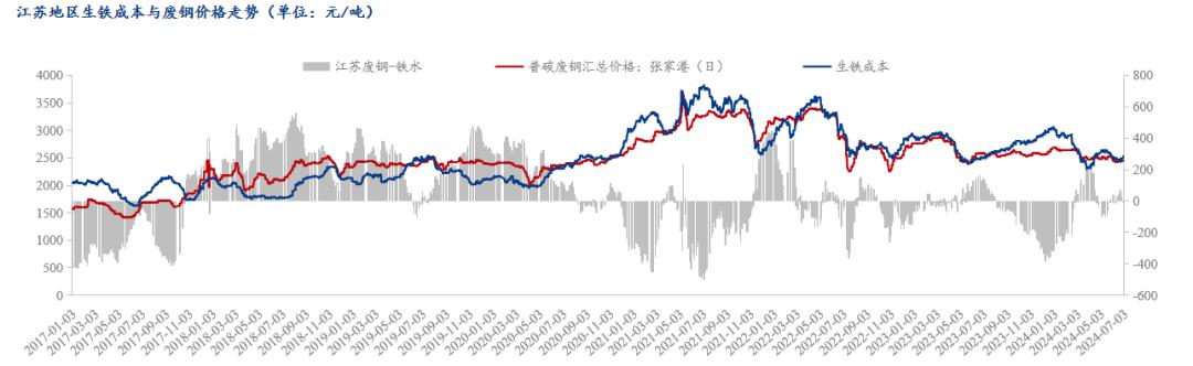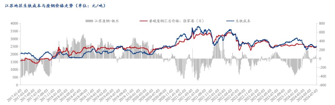 2024年上半年,鐵廢差來看,廢鋼多數(shù)時間仍是倒掛鐵水成本,鐵廢差平均值-36.68元/噸,較2023年平均值-55元/噸回升18.32元/噸,廢鋼整體性價比優(yōu)勢較2023年有所減弱。