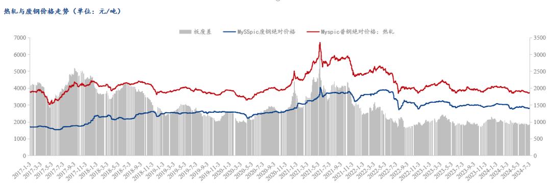 2024年上半年,板廢差整體震蕩收縮,但收縮程度明顯低于螺廢差。板廢差由年初的1042.94元/噸震蕩收縮至912.4元/噸,降幅130.54元/噸。年內(nèi)板廢差最高點出現(xiàn)在1月3日的1055.25元/噸;最低點出現(xiàn)在3月11日的896.92元/噸;平均值966.94元/噸,較2023年螺廢差平均值995.94元/噸下降29元/噸。由于上半年鋼材出口表現(xiàn)較好,板材的整體表現(xiàn)明顯強于螺紋鋼,因此板廢差的收縮程度也明顯低于螺廢差。