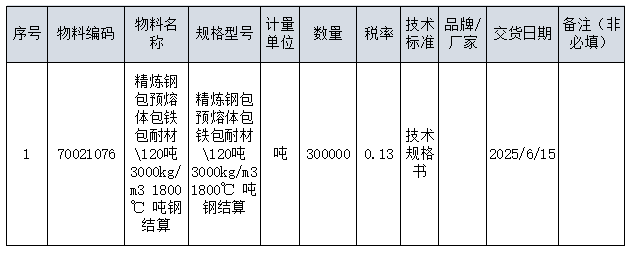 項(xiàng)目名稱:酒鋼集團(tuán)不銹鋼分公司5月份精煉鋼包預(yù)熔體包鐵包耐材集中采購預(yù)告