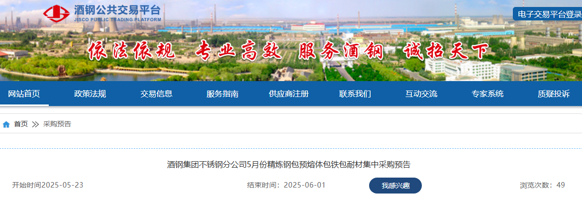 供應(yīng)鏈管理分公司關(guān)于酒鋼集團(tuán)不銹鋼分公司5月份精煉鋼包預(yù)熔體包鐵包耐材集中采購,現(xiàn)發(fā)布采購預(yù)告,請(qǐng)符合資格要求的供方參與報(bào)名,具體如下: