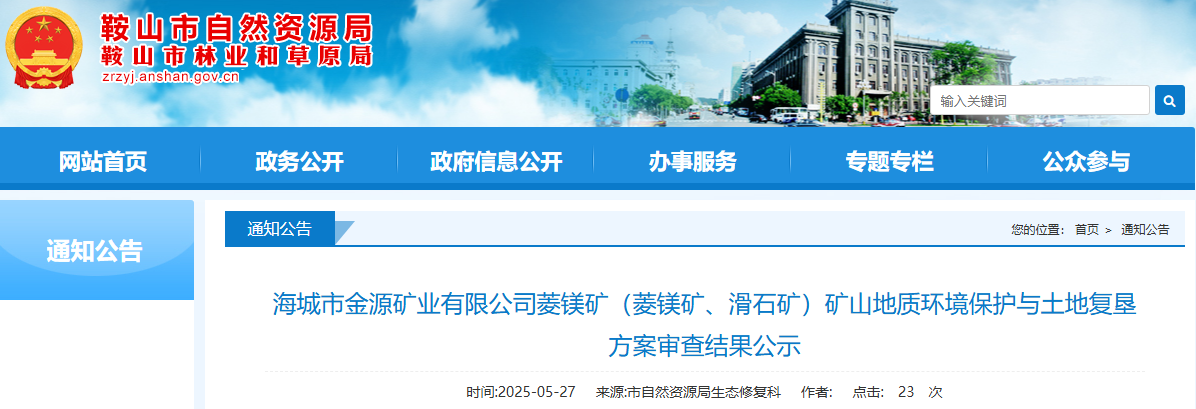 根據(jù)《土地復(fù)墾條例》、《土地復(fù)墾條例實(shí)施辦法》、《自然資源部關(guān)于規(guī)范臨時(shí)用地管理的通知》(自然資規(guī)〔2021〕2號)、《關(guān)于加強(qiáng)土地復(fù)墾工作的通知》(遼自然資發(fā)〔2021〕3號)和《關(guān)于加強(qiáng)土地復(fù)墾方案編制及評審工作的通知》(遼國土資發(fā)〔2008〕22號)等文件的有關(guān)規(guī)定和要求,我局組織專家對海城市金源礦業(yè)有限公司菱鎂礦(菱鎂礦、滑石礦)礦山地質(zhì)環(huán)境保護(hù)與土地復(fù)墾方案進(jìn)行了審查?,F(xiàn)將擬通過的該方案及專家評審意見進(jìn)行公示,公示期自發(fā)布之日起7個(gè)工作日。