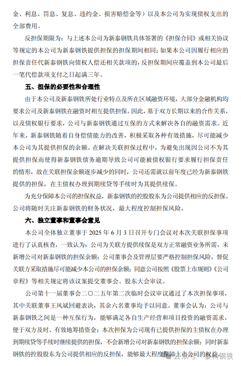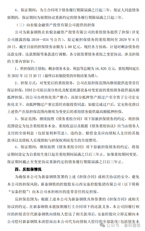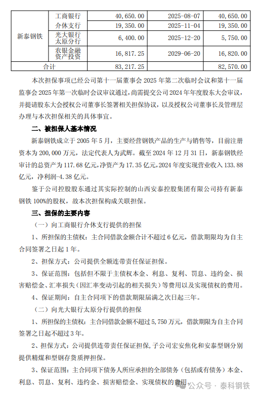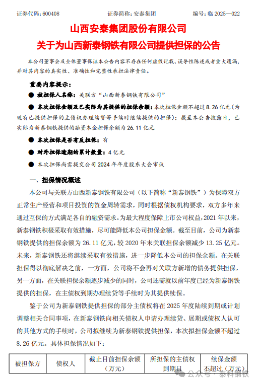6月6日,安泰集團(tuán)發(fā)布公告稱,將為關(guān)聯(lián)方山西新泰鋼鐵有限公司提供不超過8.26億元的擔(dān)保,主要用于現(xiàn)有已提供擔(dān)保的主債權(quán)辦理續(xù)貸等手續(xù)時(shí)繼續(xù)提供的擔(dān)保。截至公告披露日,公司已實(shí)際為新泰鋼鐵提供的融資本金擔(dān)保余額為26.11億元。