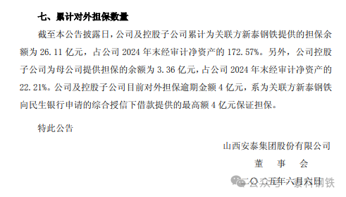 本次擔(dān)保由新泰鋼鐵的控股股東山西安泰控股集團(tuán)有限公司提供了反擔(dān)保,并需提交公司2024年年度股東大會(huì)審議。目前,公司及控股子公司累計(jì)為新泰鋼鐵提供的擔(dān)保余額占公司2024年末經(jīng)審計(jì)凈資產(chǎn)的 172.57%。此外,公司及控股子公司對外擔(dān)保逾期金額達(dá)4億元。