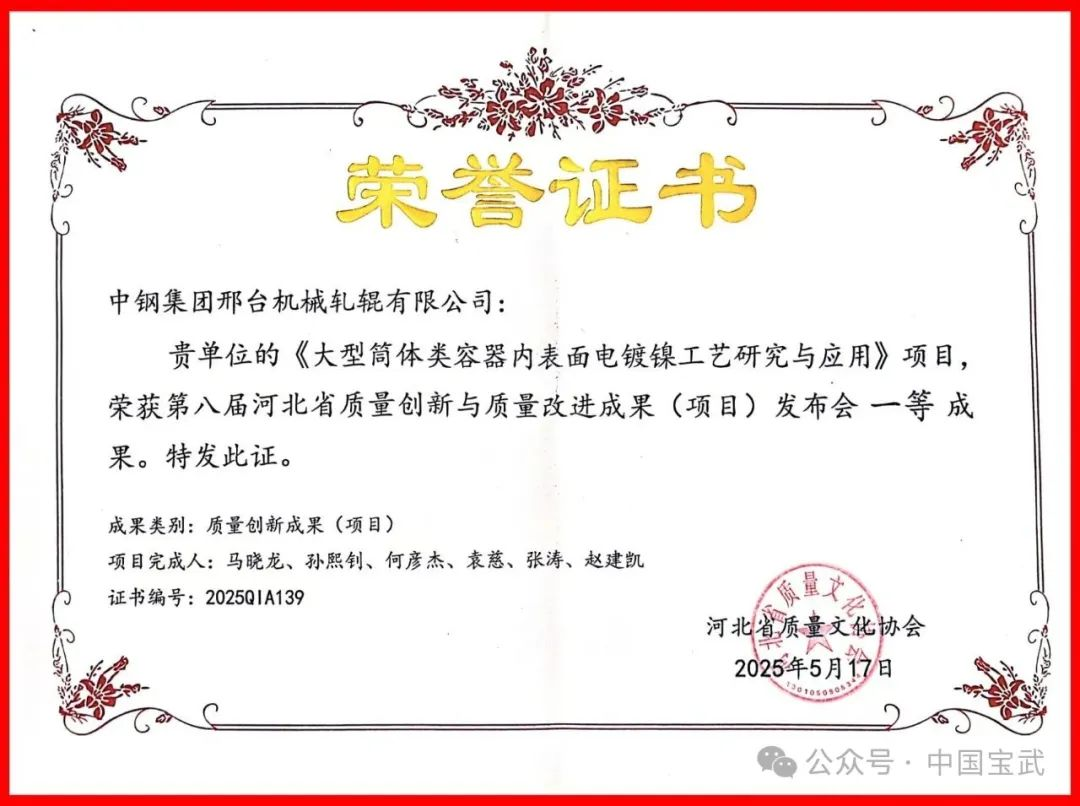 近日,在第八屆河北省質(zhì)量創(chuàng)新與質(zhì)量改進(jìn)成果發(fā)布會(huì)暨經(jīng)驗(yàn)交流會(huì)上,寶武智維、寶武重工中鋼邢機(jī)《大型筒體類(lèi)容器內(nèi)表面電鍍鎳工藝研究與應(yīng)用》《打造熱處理數(shù)字化車(chē)間》《無(wú)縫鋼管用超高性能軋輥技術(shù)研究及應(yīng)用》3項(xiàng)質(zhì)量創(chuàng)新成果,從168項(xiàng)入圍成果中脫穎而出分別榮獲一等獎(jiǎng)和二等獎(jiǎng)。