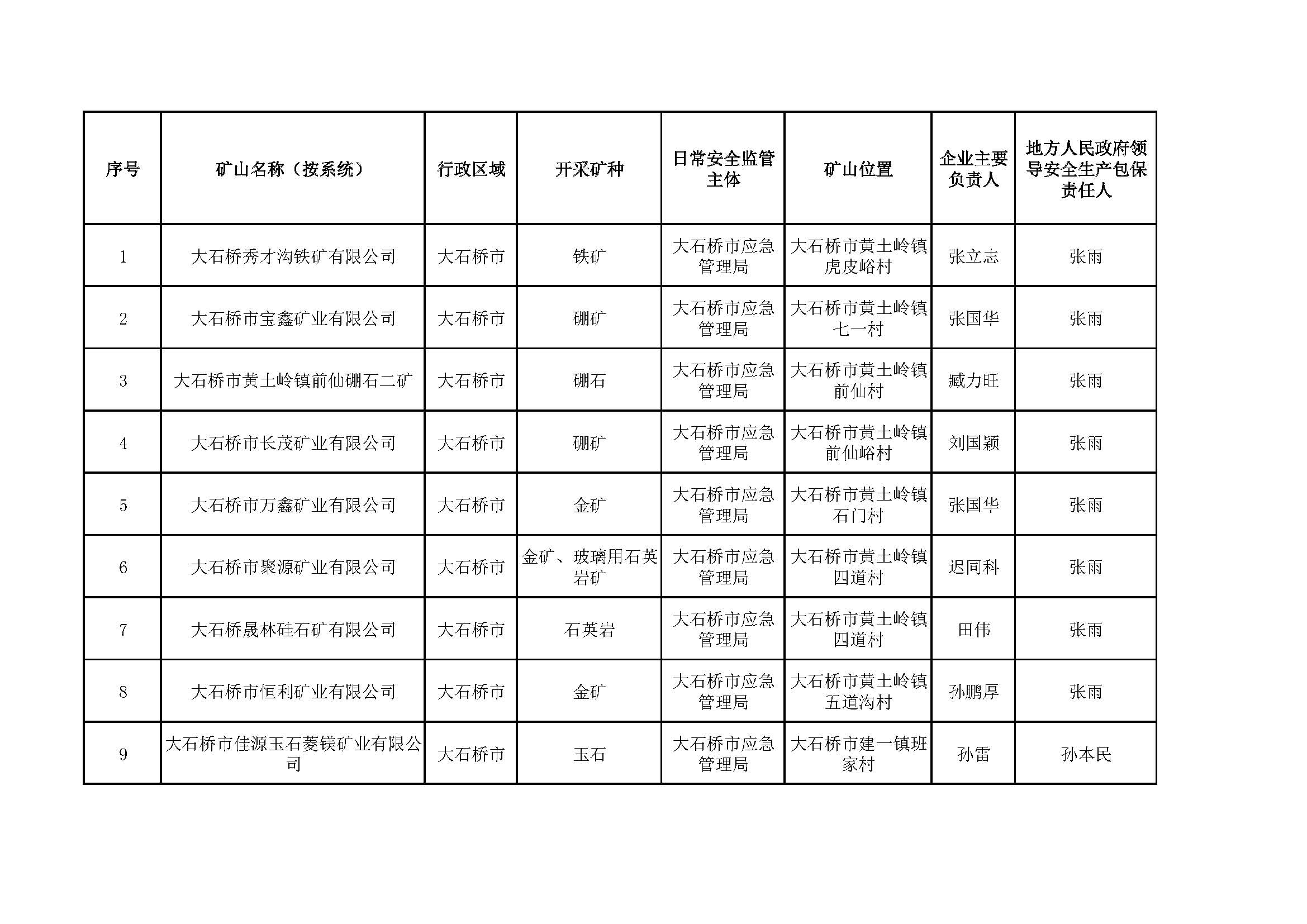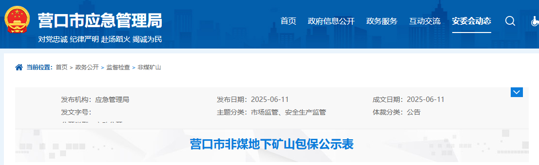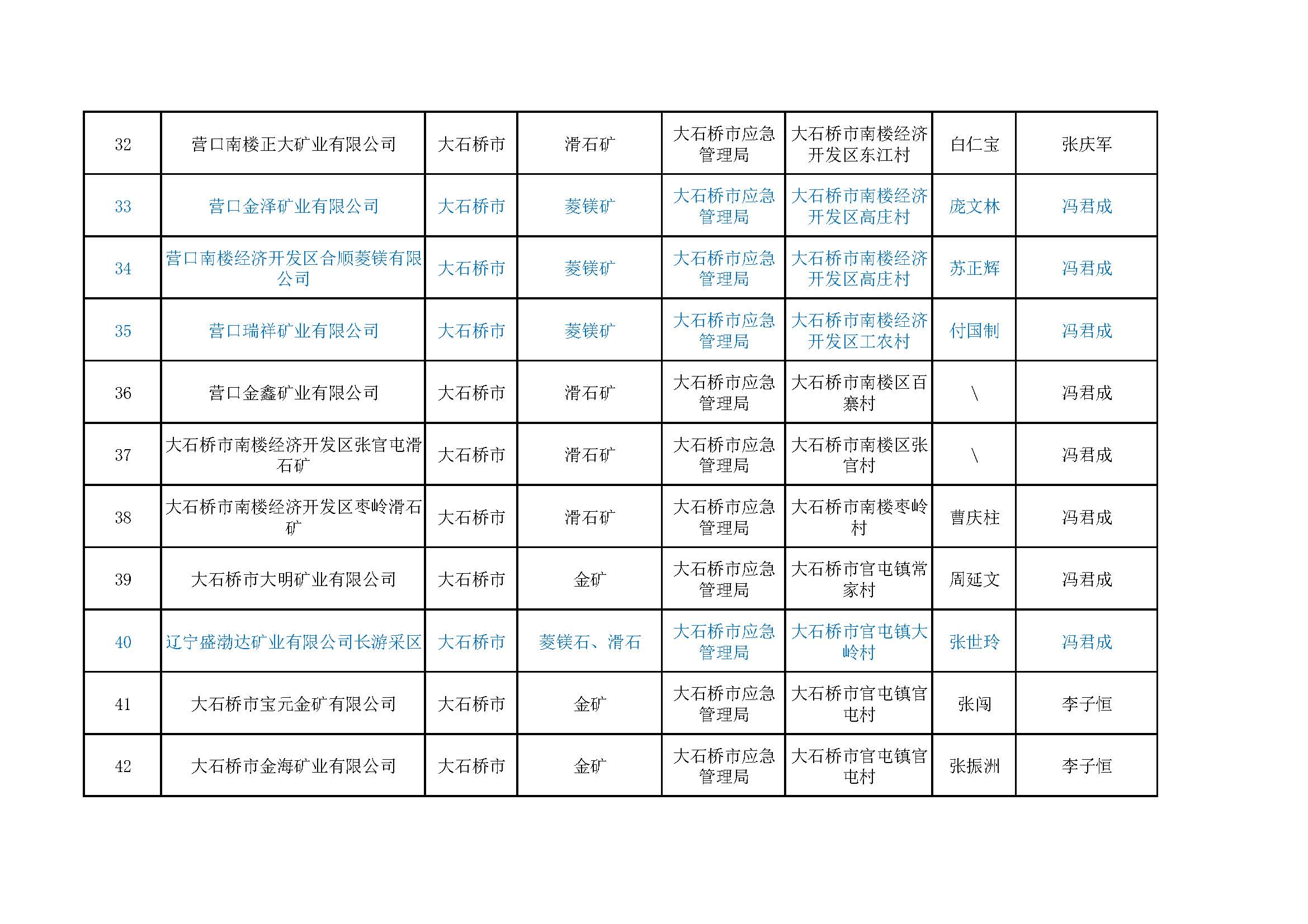 營口市非煤地下礦山包保公示表,含6家菱鎂礦山