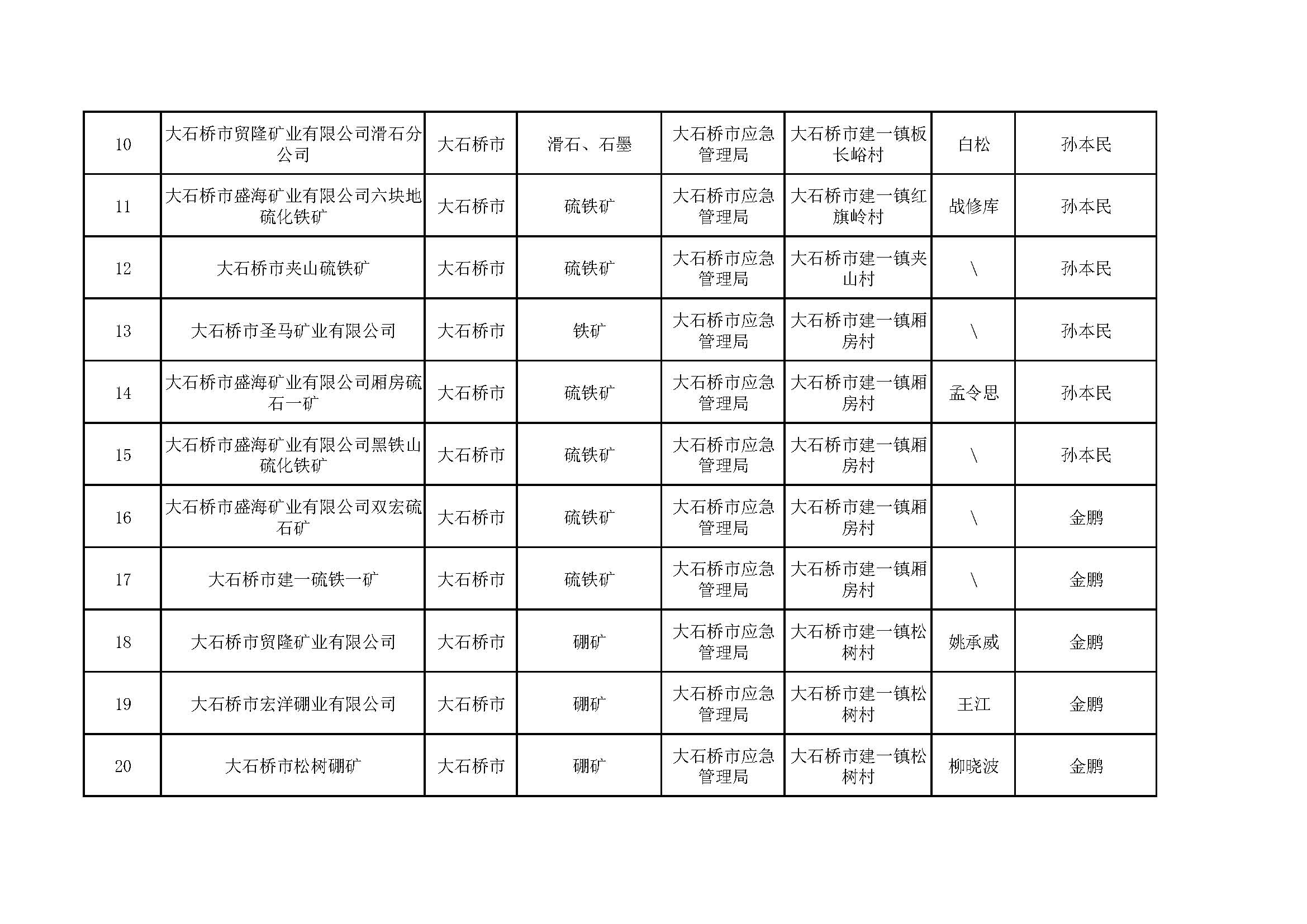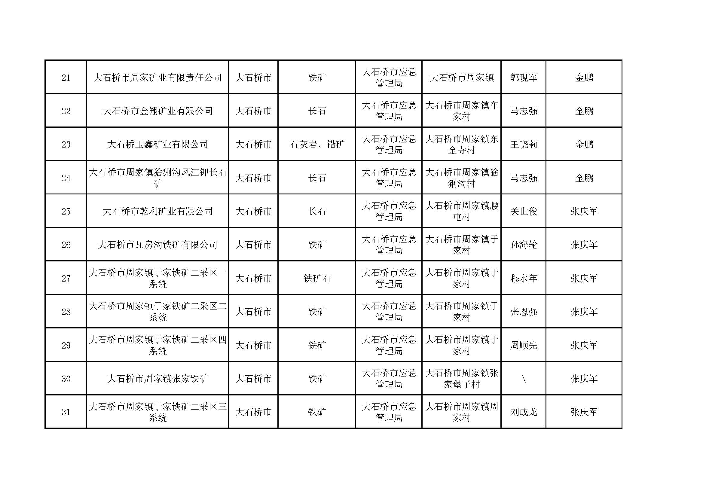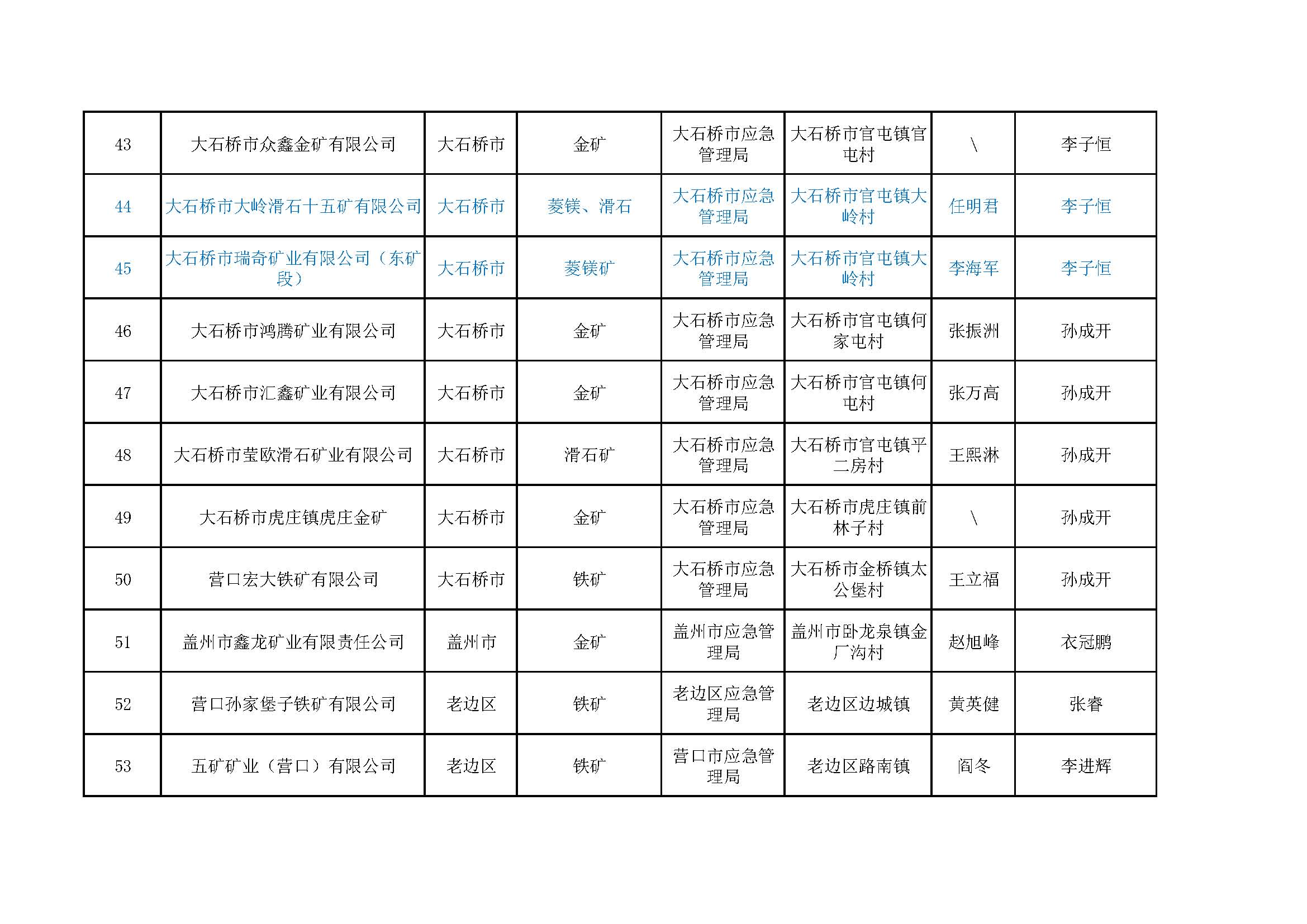 營口市非煤地下礦山包保公示表,含6家菱鎂礦山