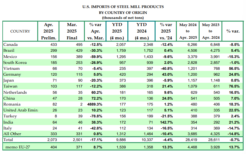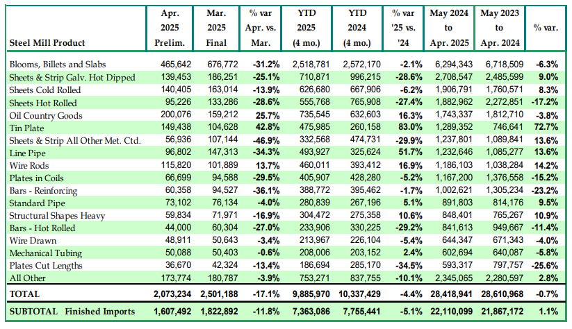 美國鋼鐵協(xié)會(huì)(AISI)報(bào)告稱,2025年4月份,美國鋼材進(jìn)口量207.3萬凈噸(NT),環(huán)比下降17.1%,同比下降26%;其中成品鋼進(jìn)口量160.7萬凈噸(NT),環(huán)比下降11.8%。
