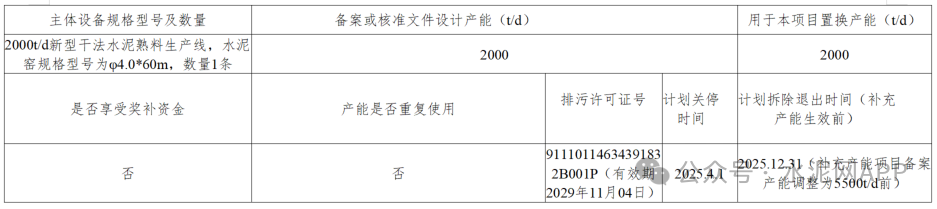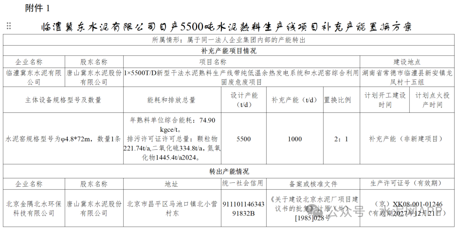 公示顯示,臨澧冀東水泥有限公司5500t/d新型干法水泥熟料生產(chǎn)線帶純低溫余熱發(fā)電系統(tǒng)和水泥窯綜合利用固廢危廢項(xiàng)目補(bǔ)充產(chǎn)能1000t/d;出讓產(chǎn)能來(lái)自北京金隅北水環(huán)??萍加邢薰?000t/d水泥熟料生產(chǎn)線,置換比例2:1。