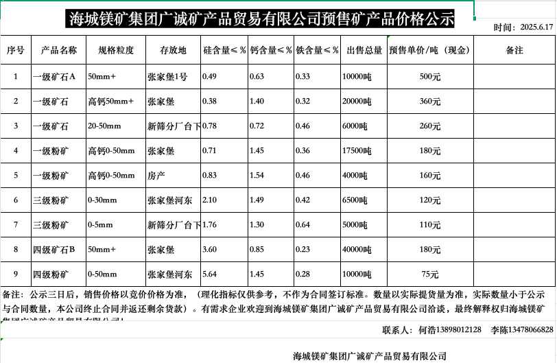 海城鎂礦集團廣誠礦產(chǎn)品貿(mào)易有限公司預售礦產(chǎn)品價格公示