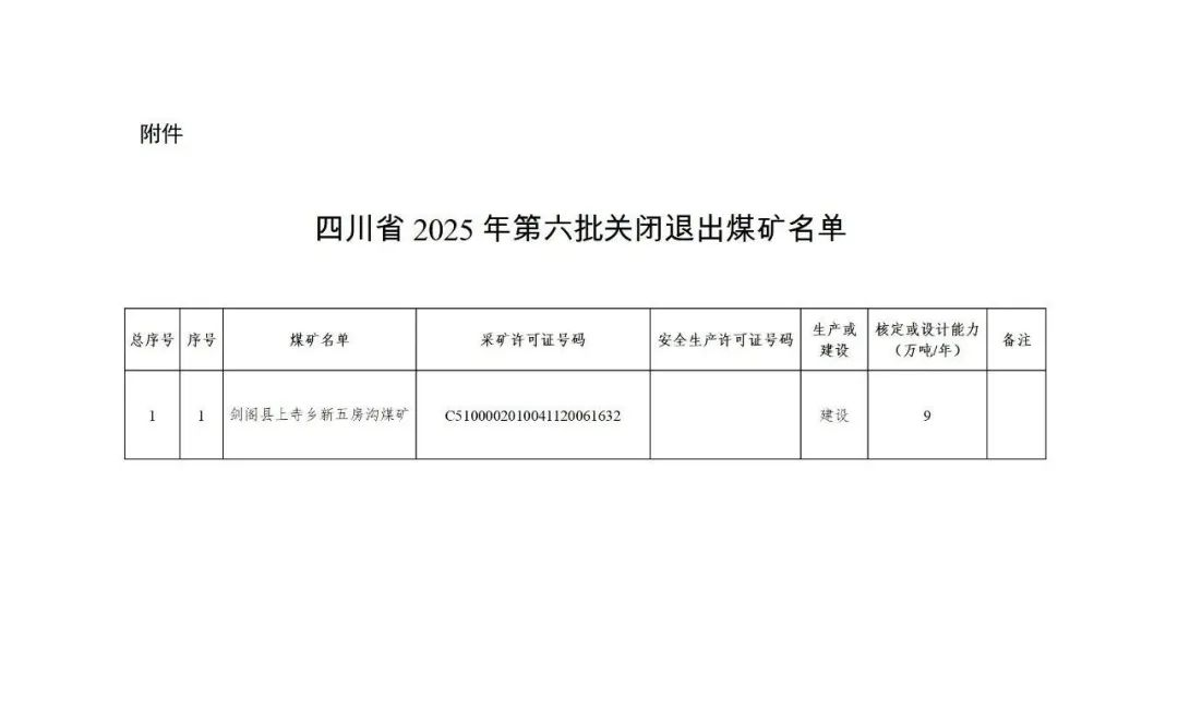 附件:四川省2025年第六批關(guān)閉退出煤礦名單