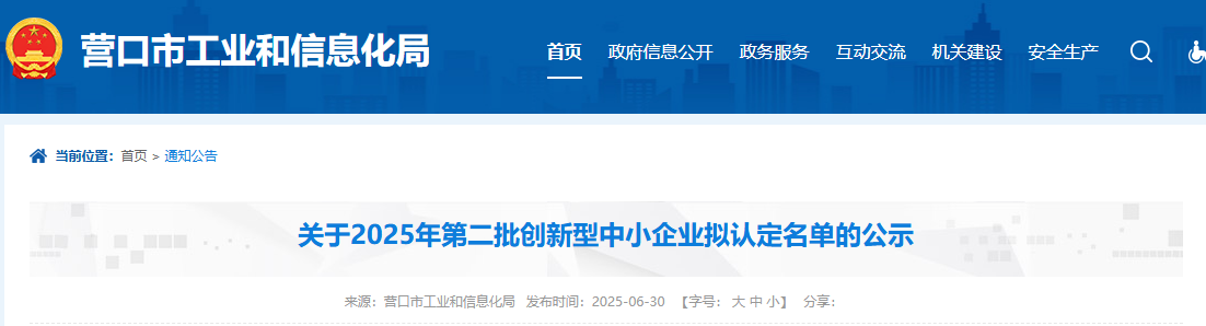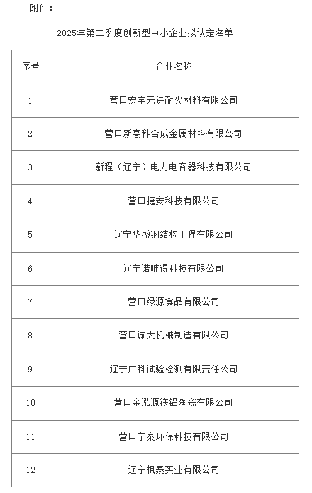 按省工信廳《關(guān)于做好2025年度創(chuàng)新型中小企業(yè)申報工作的通知》要求,經(jīng)企業(yè)登錄優(yōu)質(zhì)中小企業(yè)梯度培育平臺自愿申報,各縣(市)區(qū)、園區(qū)工信主管部門推薦,市工信局初審,擬認(rèn)定營口宏宇元進(jìn)耐火材料有限公司等12家企業(yè)為2025年第二批創(chuàng)新型中小企業(yè),現(xiàn)將通過名單予以公示。任何單位或個人對公示有異議的,可在公示期內(nèi)與市工信局聯(lián)系。