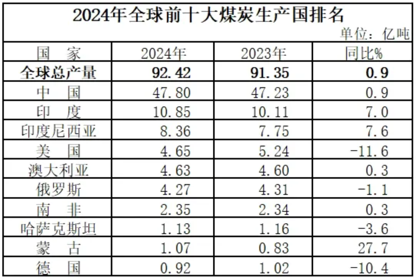 根據(jù)《年鑒》,2024年,中國煤炭產(chǎn)量47.8億噸,同比增長0.9%,占全球總產(chǎn)量的51.7%。煤炭產(chǎn)量億噸以上的國家為9個,分別為,中國、印度、印度尼西亞、美國、澳大利亞、俄羅斯、南非、哈薩克斯坦、蒙古國。其中,蒙古國產(chǎn)量首次過億噸,且增幅最大,達(dá)27.7%,中國、印度、印度尼西亞、澳大利亞和南非煤炭產(chǎn)量較上年有所增加。