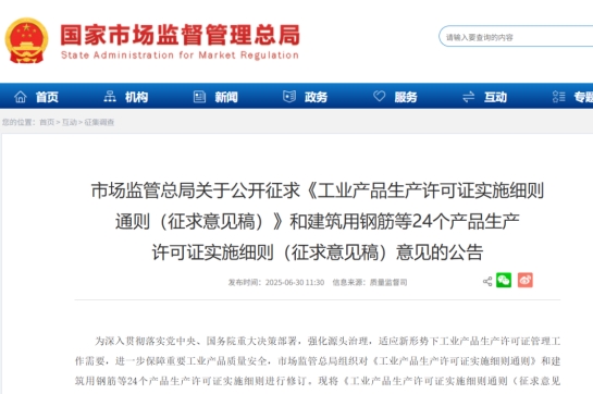 日前,市場監(jiān)管總局組織對《工業(yè)產(chǎn)品生產(chǎn)許可證實施細(xì)則通則》和建筑用鋼筋等24個產(chǎn)品生產(chǎn)許可證實施細(xì)則進(jìn)行修訂。現(xiàn)將《工業(yè)產(chǎn)品生產(chǎn)許可證實施細(xì)則通則(征求意見稿)》和建筑用鋼筋等24個產(chǎn)品生產(chǎn)許可證實施細(xì)則(征求意見稿)向社會公開征求意見。