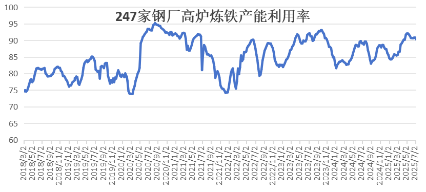 目前樣本鋼企高爐煉鐵產(chǎn)能利用率90.29%,環(huán)比減少0.54%,日均鐵水產(chǎn)量240.85萬噸,環(huán)比減少1.44萬噸,產(chǎn)量雖然下浮下降,但依舊維持在240+的相對(duì)高位水平,對(duì)原材料的需求仍存。