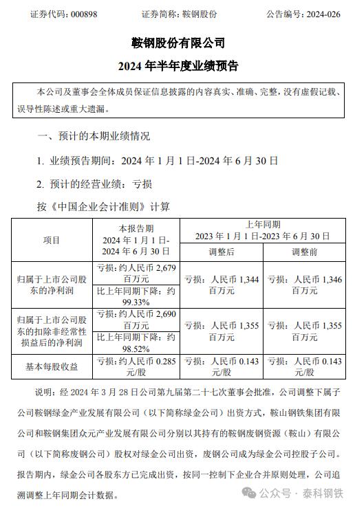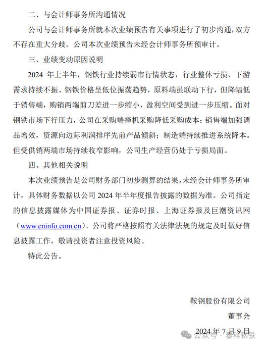 鞍鋼股份7月9日發(fā)布業(yè)績預告,預計2024年1-6月歸屬凈利潤虧損約26.79億元。公告中解釋本次業(yè)績變動的原因為:2024 年上半年,鋼鐵行業(yè)持續(xù)弱市行情狀態(tài),行業(yè)整體虧損,下游需求持續(xù)不振、鋼鐵價格呈低位振蕩趨勢,原料端雖聯(lián)動下行,但降幅低于銷售端,購銷兩端剪刀差進一步縮小,盈利空間受到進一步壓縮。面對鋼鐵市場下行壓力,公司在采購端擇機采購降低采購成本;銷售端加強調品增效,資源向邊際利潤排序先前產(chǎn)品傾斜;制造端持續(xù)推進系統(tǒng)降本。但受供銷兩端市場持續(xù)收窄影響,公司生產(chǎn)經(jīng)營仍處于虧損局面。鞍鋼股份2024年一季報顯示,公司主營收入273.43億元,同比下降11.35%;歸母凈利潤-16.57億元,同比下降1012.08%;扣非凈利潤-16.88億元,同比下降1025.33%;負債率45.29%,投資收益1.0億元,財務費用5600.0萬元,毛利率-3.45%。