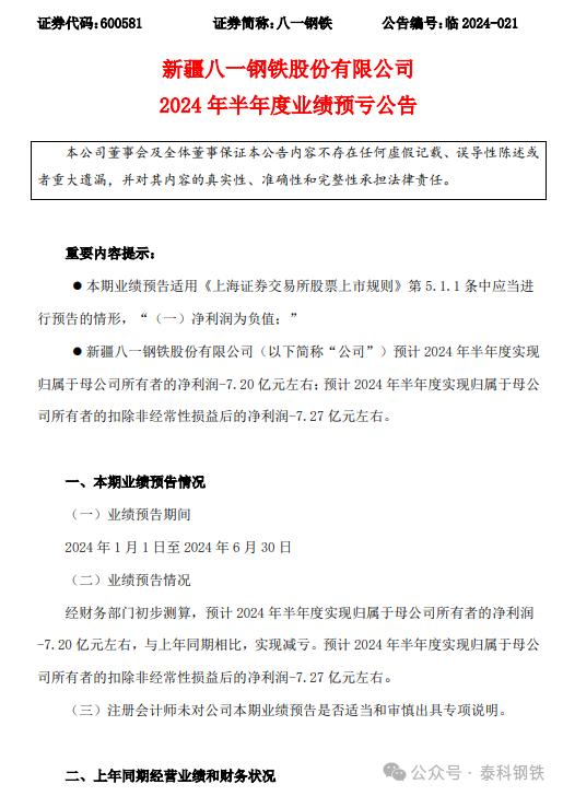 八一鋼鐵7月9日晚間披露業(yè)績(jī)預(yù)告,預(yù)計(jì)2024年上半年歸母凈利潤(rùn)虧損7.2億元,上年同期虧損7.71億元;扣非凈利潤(rùn)虧損7.27億元,上年同期虧損7.37億元。以7月9日收盤價(jià)計(jì)算,八一鋼鐵目前市盈率(TTM)約為-3.68倍,市凈率(LF)約2.97倍,市銷率(TTM)約0.18倍。