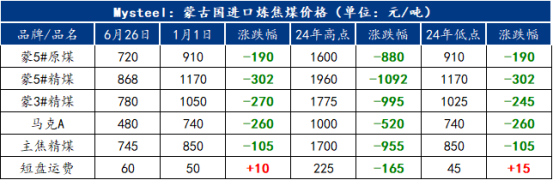 國內(nèi)雙焦市場弱勢運行,進(jìn)口蒙古國煉焦煤隨之下跌,口岸各煤種銷售價格從年初高位逐月下滑,現(xiàn)已接近貿(mào)易企業(yè)成本線,但短盤運費、監(jiān)管區(qū)倉儲等固定成本費用變化不大,口岸貿(mào)易企業(yè)利潤空間不斷受到擠壓。部分企業(yè)近期暫停拉運,轉(zhuǎn)向消化監(jiān)管區(qū)現(xiàn)有庫存,等待三季度市場行情。截止6月26日甘其毛都口岸蒙5#原煤口岸提貨含稅價720元/噸,環(huán)比年初下跌190元/噸;蒙5#精煤烏不浪口金泉工業(yè)園區(qū)含稅價868元/噸,環(huán)比年初下跌302元/噸;甘其毛都口岸蒙3#精煤口岸提貨含稅價780元/噸,環(huán)比年初下跌270元/噸;策克口岸馬克A原煤含稅價480元/噸,環(huán)比年初下跌260元/噸;滿都拉主焦精煤含稅價745元/噸,環(huán)比年初下跌105元/噸。但與之對應(yīng)的甘其毛都口岸短盤運費60元/噸,環(huán)比年初上漲10元/噸。