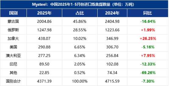 據(jù)海關(guān)總署最新數(shù)據(jù)顯示,截止5月底,2025年中國進(jìn)口量煉焦煤總計4371.39萬噸,同比下降7.3%?。其中,蒙古國作為我國進(jìn)口煤的主要來源國,減量尤為明顯,年同比下降16.64%(-400.12萬噸)。2025年初三大口岸過貨量目標(biāo)增長至8100萬噸,較2024年過貨量目標(biāo)增長15.71%,較2024年實際完成過貨量增長8.0%。過貨目標(biāo)增加導(dǎo)致口岸監(jiān)管區(qū)周轉(zhuǎn)壓力明顯,庫存持續(xù)高位,1月底至4月底連續(xù)三個月庫存在400萬噸以上,最高值超460萬噸,超出核定庫容32%。監(jiān)管區(qū)周轉(zhuǎn)壓力導(dǎo)致通關(guān)過貨不增反降,6月底甘其毛都口岸監(jiān)管區(qū)庫存再度突破至410萬噸附近,貿(mào)易企業(yè)拉運積極性不足,下半年蒙煤供應(yīng)難有大幅增長。根據(jù)Mysteel數(shù)據(jù),截止2025年5月底進(jìn)口焦煤總量達(dá)到4371.39萬噸左右,其中海運煉焦煤進(jìn)口2366.53萬噸,年同比微增2.42%左右,其中俄煤占據(jù)海運煉焦煤總量的52.73%。美國焦煤進(jìn)口量第一季度并未顯示出頹勢,主要還是由于前期搶進(jìn)口及國內(nèi)進(jìn)口關(guān)稅的靈活期導(dǎo)致到港量維持相對高位,但是到二季度進(jìn)口量開始下行。而我國國內(nèi)貿(mào)易環(huán)節(jié)認(rèn)為美國焦煤進(jìn)口在28%的進(jìn)口關(guān)稅水平下仍然難改進(jìn)口頹勢,在5月份進(jìn)口量歸零。澳大利亞、加拿大的進(jìn)口焦煤資源也因為中國一直為其機會市場,并沒有大范圍向我國發(fā)運,雖然加拿大、澳大利亞焦煤同比增加26.25%、7.95%,但是此兩者未能有效彌補美國焦煤進(jìn)口暫歇形成的缺口。而從進(jìn)口海運焦煤到港情況可以看出,俄羅斯主流礦山增加對我國國內(nèi)長協(xié)供應(yīng),4-5月其已經(jīng)重新回到海運焦煤到港量的頭部位置,每周到港量達(dá)到40-50萬噸左右。加拿大及澳大利亞焦煤資源到港波動性更強,源于國內(nèi)貿(mào)易及終端定期采買量有限、其礦山事故停產(chǎn)、且受到船運周期較長等因素影響到港。綜合全年來看,2025年中國進(jìn)口煉焦煤總量或為1.05億噸,同比減少1600萬噸左右。