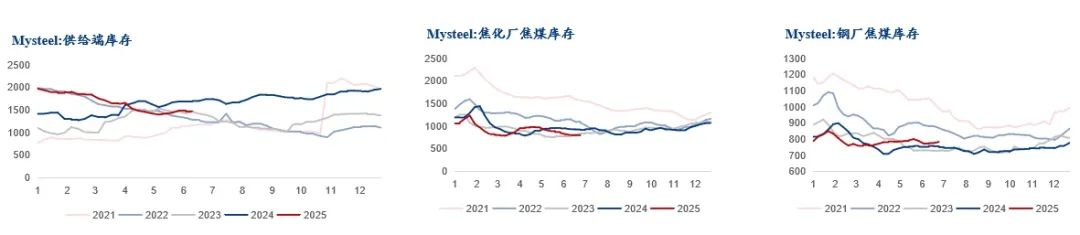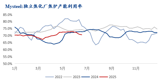 上半年煉焦煤需求維持相對高位,但顯性補庫需求較弱,下游煉焦煤持續(xù)去庫趨勢,始終保持低庫存采購策略。原料煤價格持續(xù)讓利下,焦企仍保持高位生產(chǎn)。2025上半年Mysteel全國獨立焦企開工率73.42%同比增3.9%,增幅較為明顯Mysteel鋼廠焦企開工86.9%同比下移0.21%,弱穩(wěn)運行。從獨立焦企看,上半年獨立焦企開工較為平穩(wěn)保持小幅上升趨勢,華北焦企用煤消耗高于去年同期水平,華東以及東北區(qū)域焦企開工率低于去年同期,疊加區(qū)域性用煤結(jié)構(gòu)或有差異,華北焦企庫存普遍低于去年同期水平。鋼廠焦企原料煤庫存相對平穩(wěn),生產(chǎn)節(jié)奏較為穩(wěn)定。上半年用煤消耗不減,低庫存采購仍能平衡生產(chǎn)端,中間環(huán)節(jié)需求量流動下較差,上半年煉焦煤需求對價格難有明顯驅(qū)動。下半年煉焦煤市場核心矛盾是對需求考驗,從宏觀經(jīng)濟,基建房地產(chǎn)仍有調(diào)控優(yōu)化政策出臺預(yù)期,政策環(huán)境以及方向仍相對友好,其次關(guān)稅貿(mào)易變化仍有具有不確定性,對市場情緒端仍有擾動。從下游需求看,鋼材出口市場轉(zhuǎn)弱以及疊加行政減產(chǎn)仍是不確定對原料仍有一定壓制。從焦化廠用煤采購看,下游仍受季節(jié)性影響,或推動結(jié)構(gòu)性補庫需求,當(dāng)下下游庫存處于絕對低位,市場價格吻合預(yù)期下,不排除會有間接性補庫信號顯現(xiàn)。下半年從焦化廠產(chǎn)能釋放和投產(chǎn)看,下半年凈新增產(chǎn)能1459萬噸,主要分布山西、內(nèi)蒙等區(qū)域,如按期投產(chǎn)對原料煤實際消耗有效果增加。從利潤看需求,總體看下半年煉焦煤市場邊際需求或有減弱,季度性備庫需求和新增產(chǎn)能主導(dǎo)是否能夠有效帶動需求轉(zhuǎn)化,需求的風(fēng)險更多集中在下游焦企利潤進(jìn)一步擠兌后的主動減產(chǎn)力度以及鋼材出口轉(zhuǎn)弱風(fēng)險對原料煤形成負(fù)反饋。