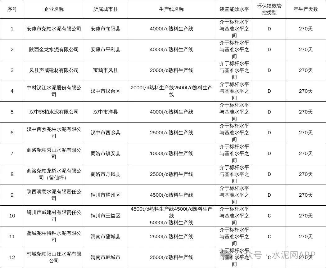 公告顯示,陜西省共12條水泥熟料生產(chǎn)線生產(chǎn)時間按270計算,具體見下表: