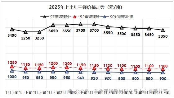 2025年1、2月份,下游鋼鐵、水泥等高溫行業(yè)需求不佳,很多企業(yè)春節(jié)假期提前了近一個月,廠家報價基本穩(wěn)定并未出現(xiàn)明顯波動。但2月下旬起,電熔鎂砂價格開始上漲,其原因是國內(nèi)外石墨電極價格開始呈上漲趨勢,同時傳出遼寧地區(qū)3月初電費價格將迎來大調(diào)整的消息。2月底電熔鎂砂生產(chǎn)企業(yè)紛紛調(diào)整價格,并表示電價正式調(diào)整后,產(chǎn)品價格會再次上調(diào),期間很多龍頭企業(yè)已停止報價。3月初遼寧地區(qū)電熔鎂砂類產(chǎn)品報價再次大幅上漲,重?zé)V砂企業(yè)也在嘗試跟風(fēng)調(diào)價,但因企業(yè)庫存積壓太多,下游行業(yè)需求又持續(xù)降低,重?zé)V砂調(diào)價缺少支撐并未得到市場認(rèn)可。而輕燒氧化鎂也受出口和國內(nèi)硫酸鎂市場下行影響,價格呈下降趨勢,其中90輕燒氧化鎂因其用途主要是供脫硫使用,出貨量相對較好。期間,97高純鎂砂降價后報價比95中檔鎂砂還便宜50元/噸,導(dǎo)致部分中檔鎂砂企業(yè)銷售量銳減,庫存積壓嚴(yán)重不得已停產(chǎn)。5、6月份各類鎂砂產(chǎn)品價格時有波動,但相對穩(wěn)定。
