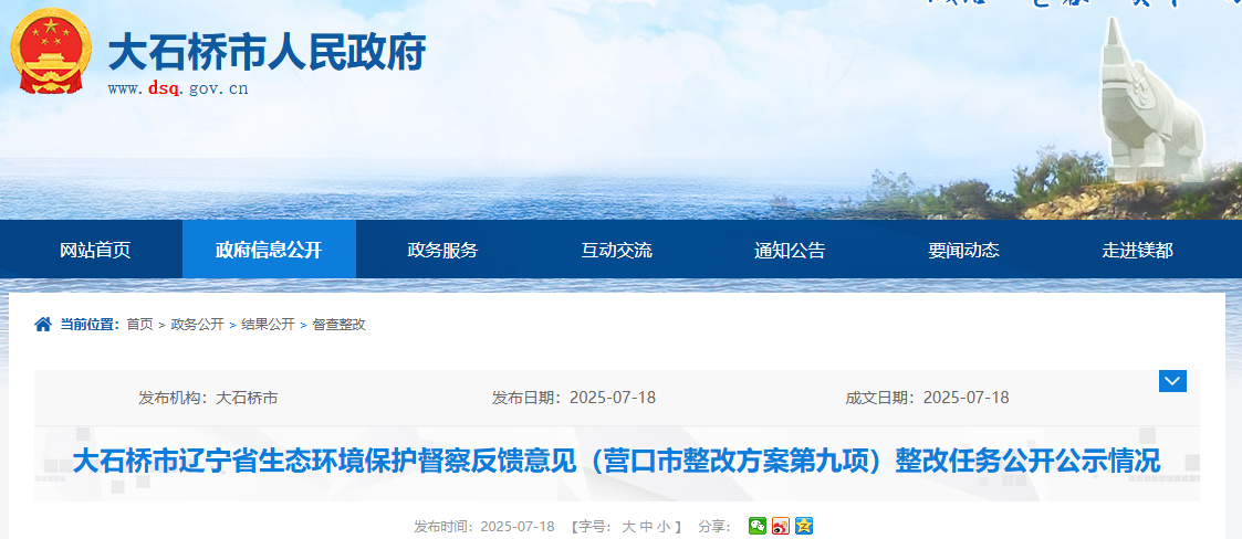 以上整改情況向社會公示,如有異議,請以書面或電話形式,向大石橋市環(huán)境保護督察整改工作領導小組辦公室、營口市大石橋生態(tài)環(huán)境分局反映。