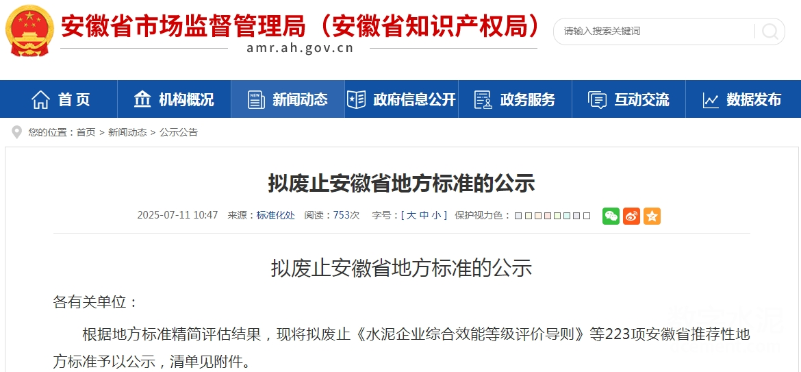 近日,安徽省市場(chǎng)監(jiān)督管理局標(biāo)準(zhǔn)化處發(fā)布《擬廢止安徽省地方標(biāo)準(zhǔn)的公示》稱,根據(jù)地方標(biāo)準(zhǔn)精簡評(píng)估結(jié)果,現(xiàn)將擬廢止《水泥企業(yè)綜合效能等級(jí)評(píng)價(jià)導(dǎo)則》等223項(xiàng)安徽省推薦性地方標(biāo)準(zhǔn)予以公示。
