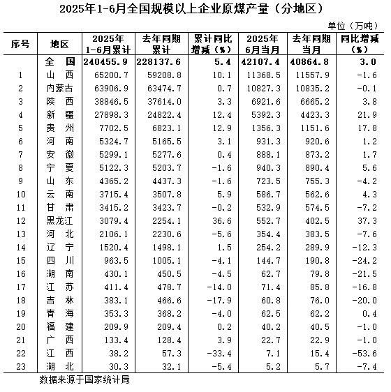 2025年1-6月份全國規(guī)模以上分省區(qū)原煤產(chǎn)量數(shù)據(jù)發(fā)布