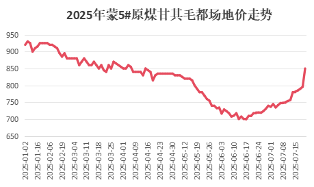 近期成交也明顯回暖,貿(mào)易商和下游終端開始加大補庫,蒙煤價格也同步上漲。截至7月23日,蒙5#原煤口岸報價900元/噸,較前期低點上漲200元/噸左右。競拍表現(xiàn)同樣強勢,本月8日進行了三場Erdenes Tavantolgoi JSC公司的蒙5#原煤競拍,全部溢價成交,成交價分別為87.7$/噸、88.2$/噸、90.2$/噸,總成交量22.4萬噸。