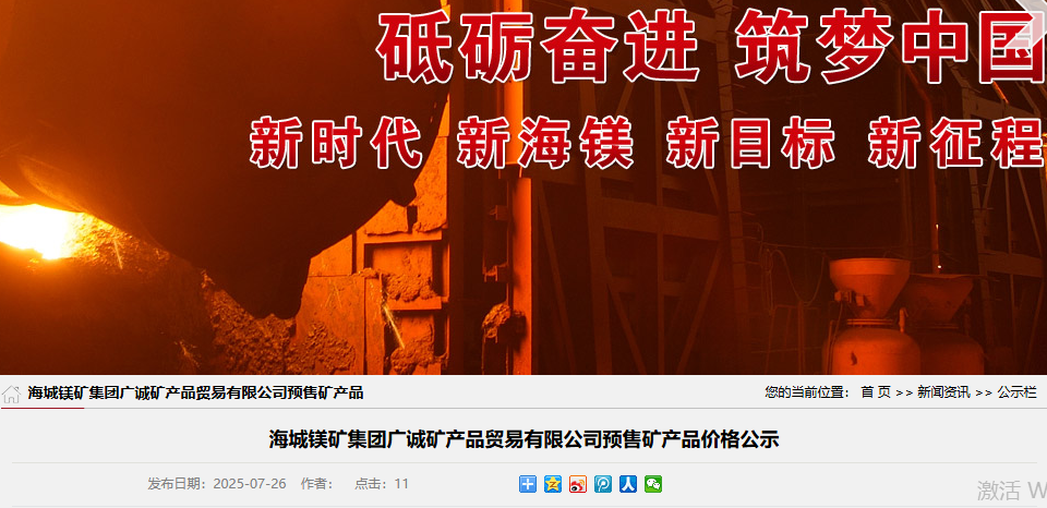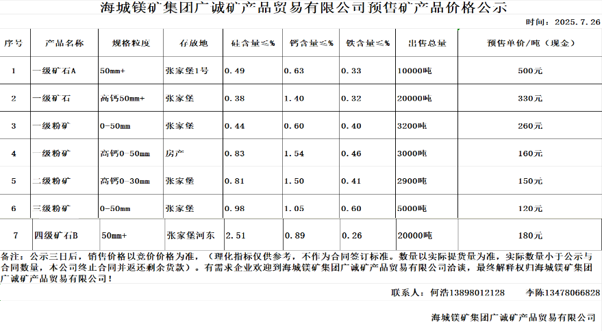 海城鎂礦集團廣誠礦產(chǎn)品貿(mào)易有限公司預售礦產(chǎn)品價格公示