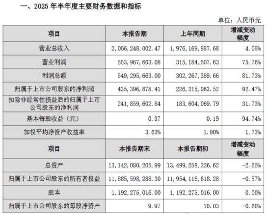 2025年上半年,得益于公司所處市場(chǎng)區(qū)域氣候適宜工程施工活動(dòng),以及去年同期連續(xù)降雨導(dǎo)致的水泥銷(xiāo)量低基數(shù),公司實(shí)現(xiàn)“水泥+熟料”銷(xiāo)量同比上升了10.90%;得益于報(bào)告期煤炭?jī)r(jià)格等下降,公司水泥平均銷(xiāo)售成本同比下降6.90%,抵消了報(bào)告期內(nèi)水泥價(jià)格同比下降5.51%的影響,水泥主業(yè)盈利水平同比有所改善。同時(shí),報(bào)告期公司投資收益(含浮盈)同比大幅增長(zhǎng),進(jìn)一步增厚了公司業(yè)績(jī)。