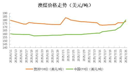 澳煤價格上漲的原因除了印度少量需求釋放也有中國市場煉焦煤現(xiàn)貨、期貨的不斷上漲的帶動,整體看中國市場的好轉(zhuǎn)尚未到達大幅采購海運煤的程度,但是部分參與者認為宏觀經(jīng)濟預(yù)期的好轉(zhuǎn)以及國家能源局發(fā)布的核查超產(chǎn)文件,會帶動國內(nèi)焦煤價格繼續(xù)上漲,情緒較為高脹。終端鋼廠尚能采購長協(xié)煤,對海運煤的需求有限,但是隨著價差的縮小也有部分市場參與者對海運煤釋放了采購興趣。此外印度也釋放了采購9月貨物的需求,貿(mào)易商也在采購9月到達的貨物,上周五有貿(mào)易商以178美元/噸的離岸價格,采購了7.5萬噸低揮發(fā)優(yōu)質(zhì)澳煤,發(fā)貨日期未定。他們預(yù)計印度會有需求,因此澳煤供應(yīng)商報價小幅上漲。