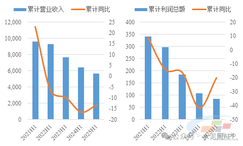 圖1、2:2025年上半年混凝土行業(yè)收入及利潤變化情況(億元,%)