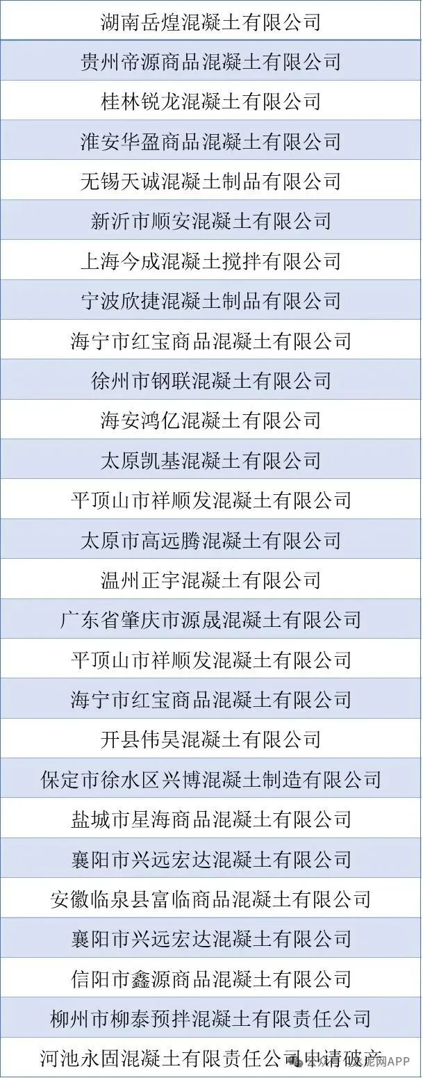 另據(jù)中國混凝土網(wǎng)報道,今年以來已有近30家混凝土企業(yè)被申請破產(chǎn),名單如下: