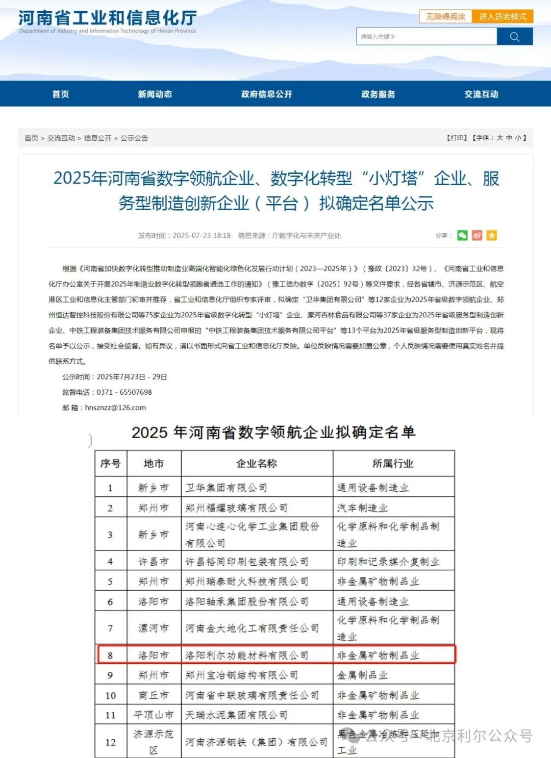 7月23日,河南省工業(yè)和信息化廳公示了“2025年河南省數(shù)字領(lǐng)航企業(yè)”擬確定名單,洛陽利爾功能材料有限公司成功入選。作為國內(nèi)高溫工業(yè)用耐火材料領(lǐng)域的領(lǐng)軍企業(yè),公司通過數(shù)字化技術(shù)深度融合生產(chǎn)制造全流程,成為河南省新材料產(chǎn)業(yè)數(shù)字化轉(zhuǎn)型的典范。這也是公司在數(shù)字化轉(zhuǎn)型領(lǐng)域獲得的又一項省級榮譽。