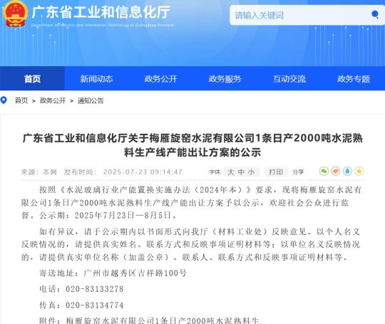 7月23日,廣東省工信廳發(fā)布“關(guān)于梅雁旋窯水泥有限公司1條日產(chǎn)2000噸水泥熟料生產(chǎn)線產(chǎn)能出讓方案的公示”。