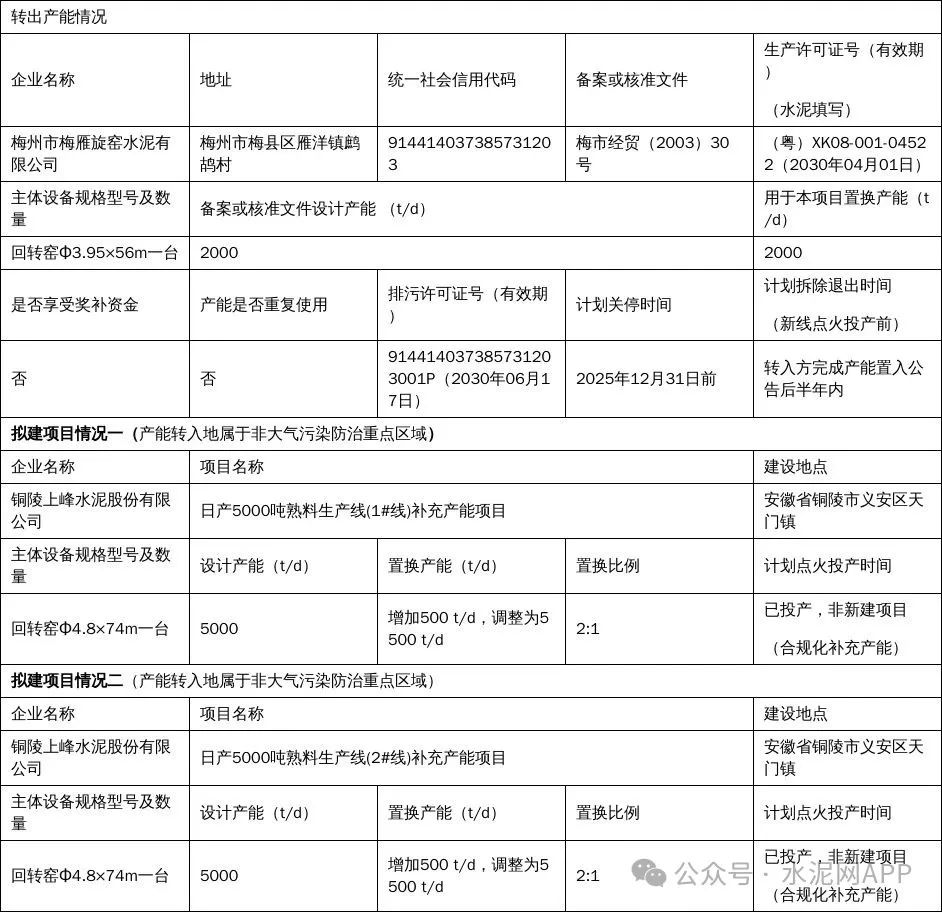 梅州市梅雁旋窯水泥2000t/d熟料生產(chǎn)線產(chǎn)能置換轉(zhuǎn)出,用于分別補充銅陵上峰水泥1#、2#窯線,兩條生產(chǎn)線各自補充500t/d,置換比例2:1。