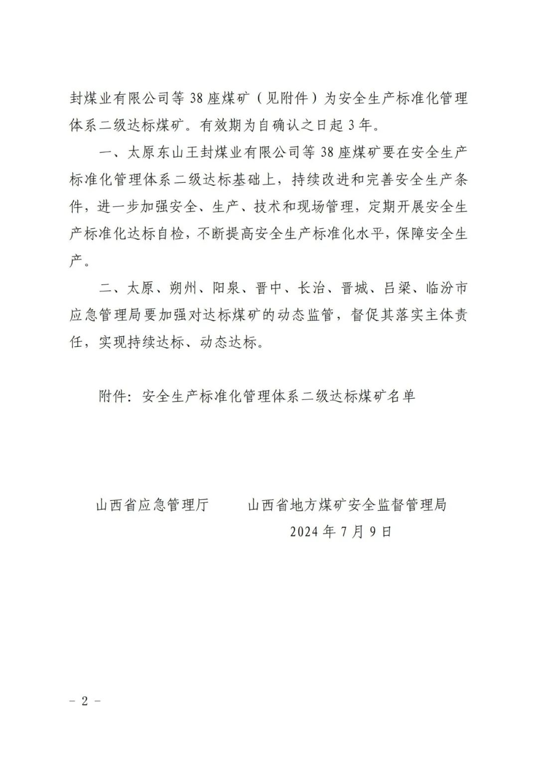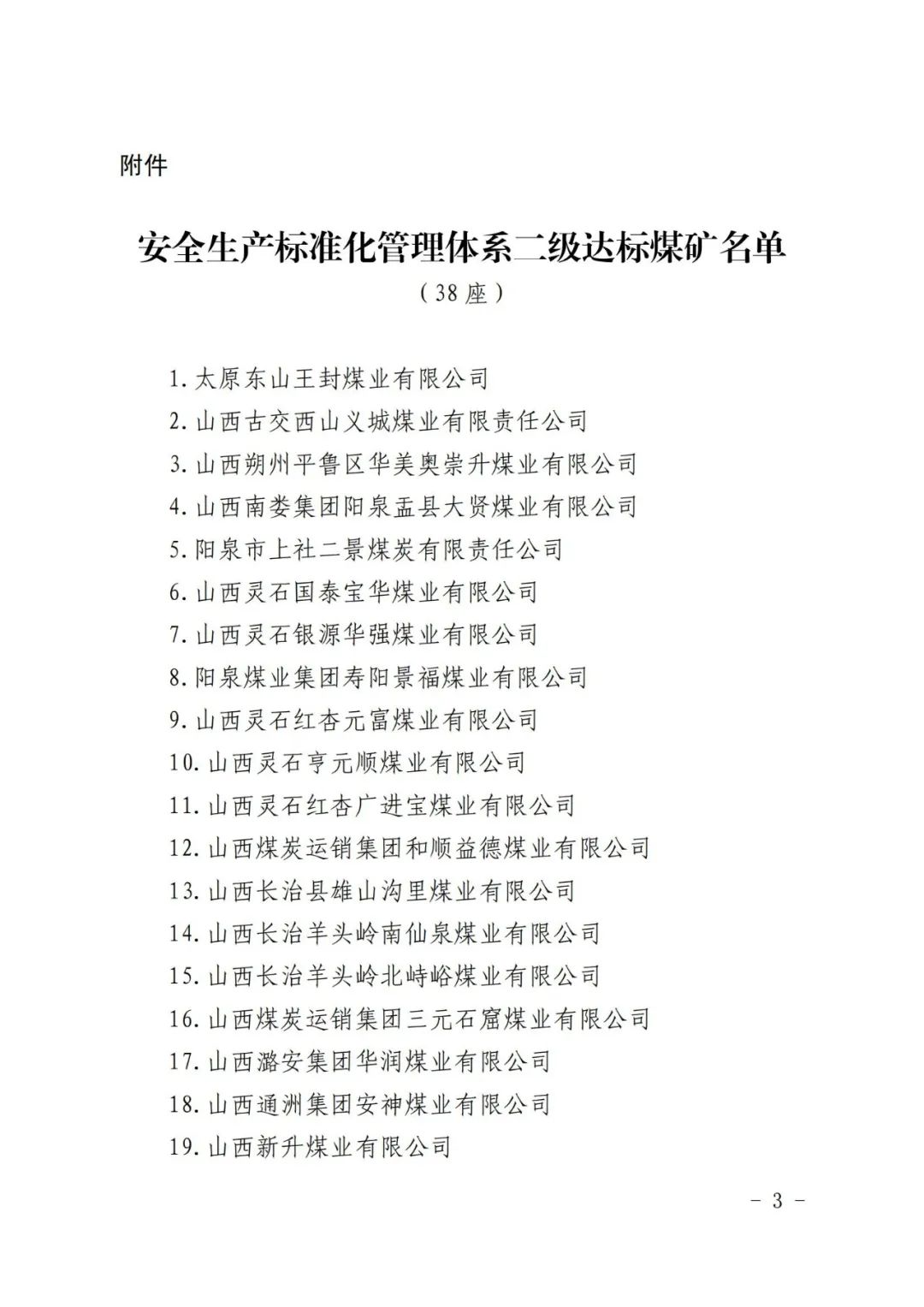 山西38座煤礦為安全生產(chǎn)標準化管理體系二級達標煤礦