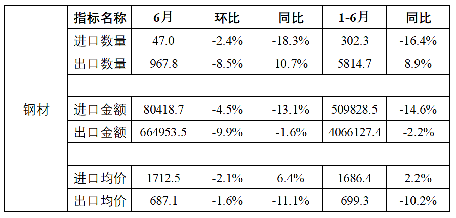 2025年6月,我國出口鋼材967.8萬噸,較上月下降8.5%,自今年3月以來環(huán)比首次出現(xiàn)下降,出口均價687.1美元/噸,較上月小幅下跌1.6%。1-6月,我國累計出口鋼材5814.7萬噸,同比增長8.9%,出口均價699.3美元/噸,同比下跌10.2%。6月,我國進口鋼材47.0萬噸,環(huán)比下降2.4%,進口均價1712.5美元/噸,環(huán)比下跌2.1%。1-6月,我國累計進口鋼材302.3萬噸,同比下降16.4%,進口均價1686.4美元/噸,同比上漲2.2%。