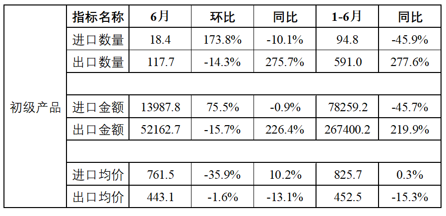 表2 2025年6月中國初級產(chǎn)品進出口情況