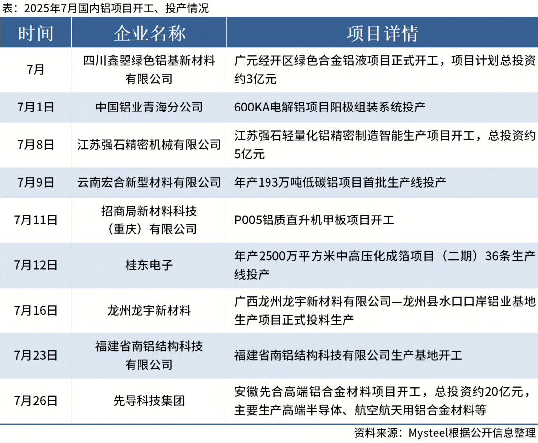 據(jù)不完全整理,2025年7月國(guó)內(nèi)共9個(gè)鋁項(xiàng)目開(kāi)工、投產(chǎn)。