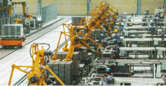 海城利爾麥格西塔材料有限公司的車間里,機(jī)器臂正有序地從生產(chǎn)線上卸下鎂碳磚。