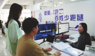 海城市公共行政服務(wù)中心工作人員正細(xì)心地為企業(yè)代表辦理手續(xù)。