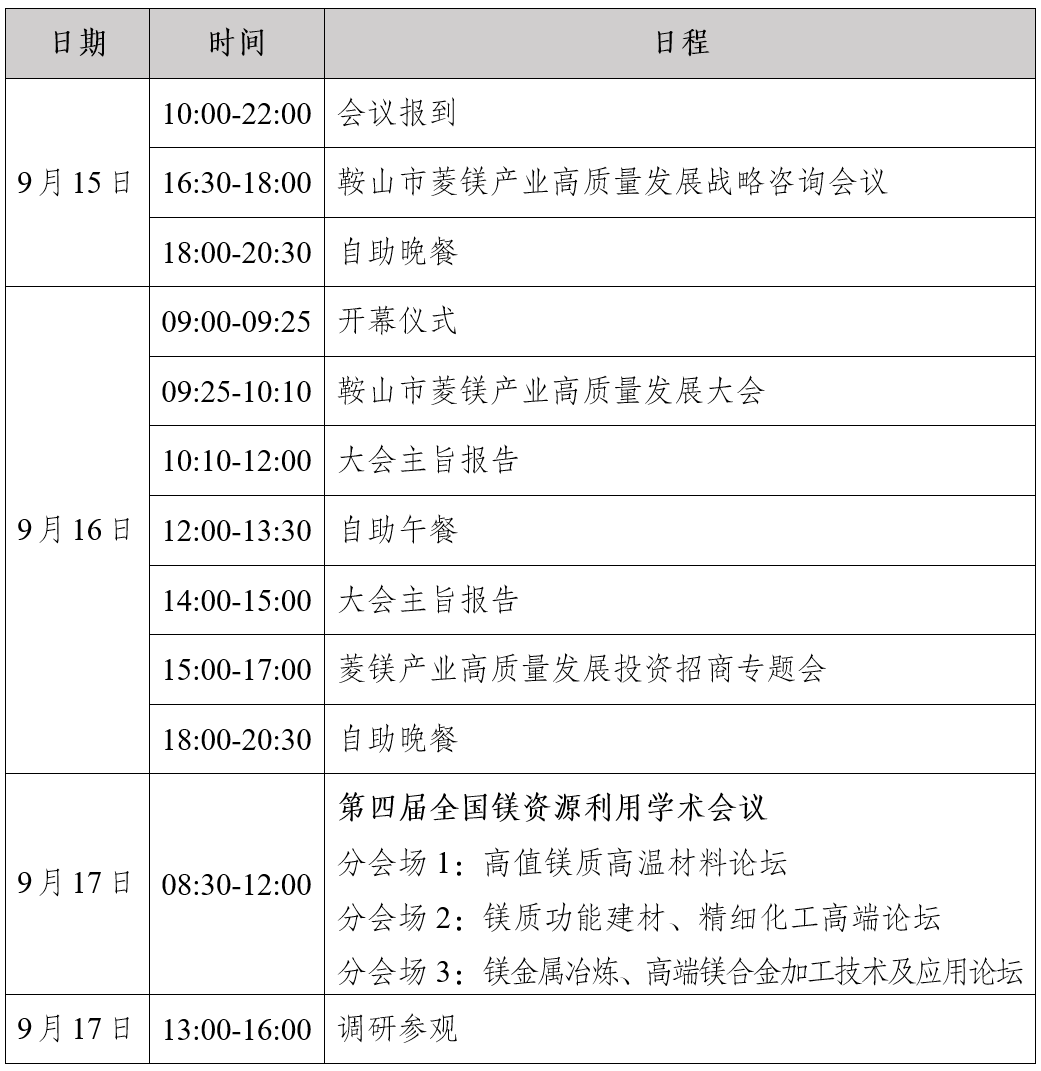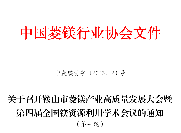 鞍山市菱鎂資源稟賦突出,保有儲(chǔ)量4.26億噸、占全國(guó)61.29%的菱鎂資源,素有“世界鎂都”的美譽(yù)。當(dāng)下,正值鞍山市菱鎂產(chǎn)業(yè)轉(zhuǎn)型升級(jí)、邁向高質(zhì)量發(fā)展的關(guān)鍵節(jié)點(diǎn),為提升鞍山市菱鎂產(chǎn)業(yè)科技創(chuàng)新能力,全力提升產(chǎn)業(yè)鏈高端化、綠色化、智能化發(fā)展,推進(jìn)產(chǎn)業(yè)鏈、創(chuàng)新鏈、人才鏈深度融合,健全鞍山市菱鎂產(chǎn)業(yè)技術(shù)、人才和產(chǎn)業(yè)體系,將于2025年9月15日-17日在遼寧省海城市舉辦“鞍山市菱鎂產(chǎn)業(yè)高質(zhì)量發(fā)展大會(huì)暨第四屆全國(guó)鎂資源利用學(xué)術(shù)會(huì)議”,旨在加強(qiáng)菱鎂產(chǎn)業(yè)科研成果交流及推廣應(yīng)用,推動(dòng)鞍山市菱鎂產(chǎn)業(yè)高質(zhì)量發(fā)展,助力鞍山市打造世界級(jí)菱鎂產(chǎn)業(yè)創(chuàng)新集群,擦亮“世界鎂都”城市名片?,F(xiàn)將相關(guān)事宜通知如下。