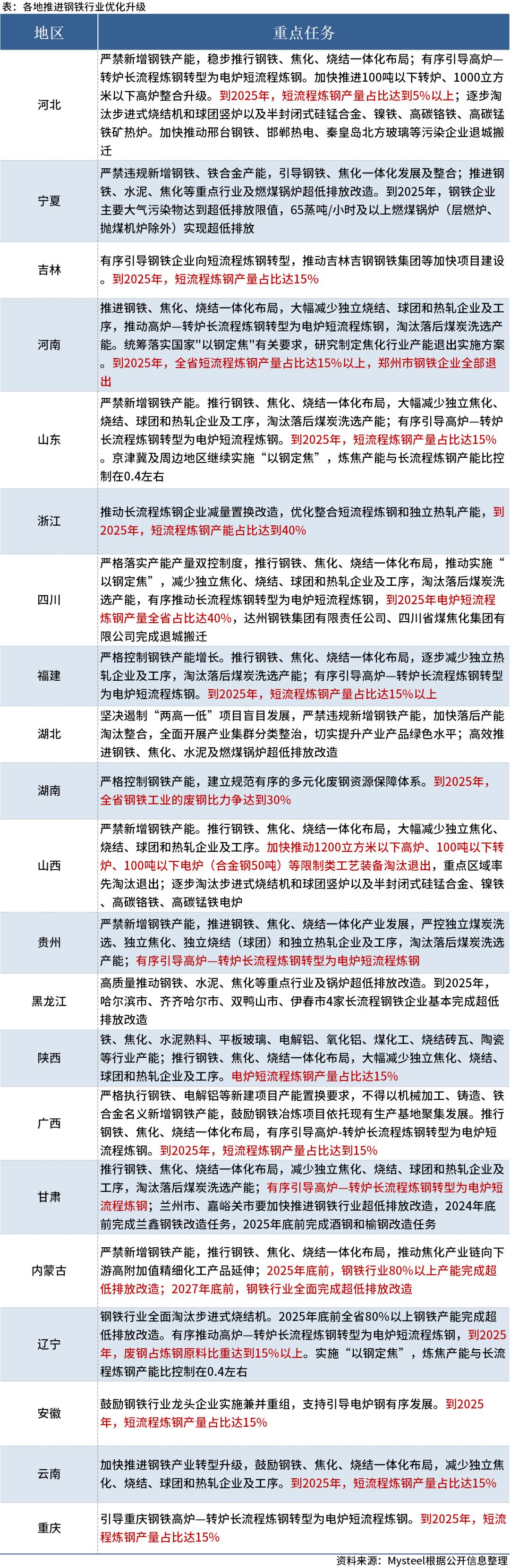 據(jù)不完全統(tǒng)計(jì),21個(gè)省份出臺“空氣質(zhì)量持續(xù)改善行動(dòng)實(shí)施方案”,要求推進(jìn)鋼鐵等重點(diǎn)行業(yè)優(yōu)化升級,包括嚴(yán)禁新增鋼鐵產(chǎn)能,提出短流程煉鋼比例的目標(biāo)等。多地提出到2025年,短流程煉鋼產(chǎn)量占比達(dá)到15%,浙江、四川到2025年短流程煉鋼產(chǎn)量占比達(dá)到40%。