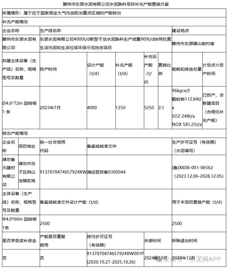 置換方案顯示,東郭水泥有限公司4000t/d新型干法水泥熟料生產(chǎn)線暨900t/d協(xié)同處置生活污泥和生活垃圾環(huán)保示范技改項(xiàng)目補(bǔ)充產(chǎn)能1250t/d,補(bǔ)充后產(chǎn)能5250t/d,置換比例為2:1。轉(zhuǎn)出產(chǎn)能來(lái)自濰坊魯元建材有限公司2500t/d水泥熟料生產(chǎn)線,已于2024年12月拆除退出。