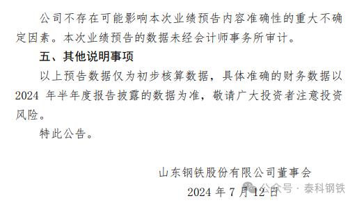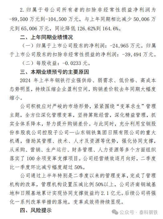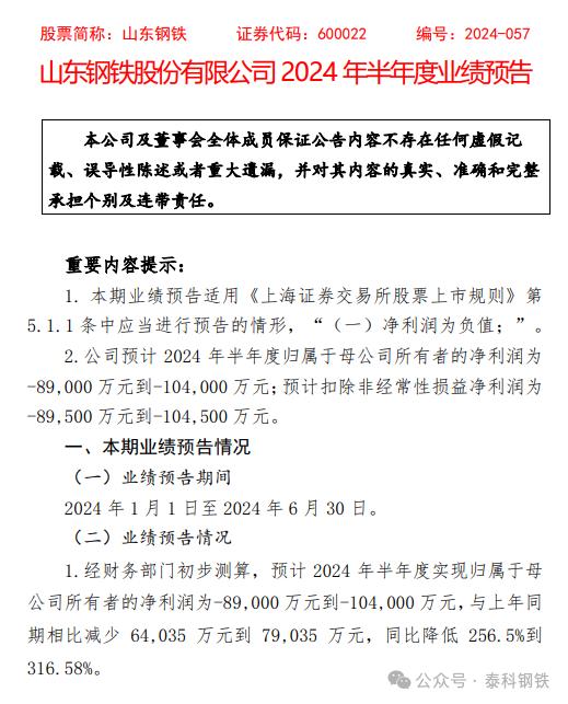 7月11日,山東鋼鐵發(fā)布2024年半年度業(yè)績預(yù)告,預(yù)計(jì)2024年半年度歸母凈利潤為虧損8.90億元到10.40億元,與上年同期相比減少6.40億元到7.90億元,同比降低256.5%到316.58%;歸母扣非凈利潤虧損8.95億元到10.45億元,與上年同期相比減少5.00億元到6.50億元,同比降低126.62%到164.6%。對(duì)于業(yè)績變動(dòng)主要原因,山東鋼鐵表示,2024年上半年鋼鐵行業(yè)強(qiáng)供給、弱需求、低價(jià)格、高成本態(tài)勢(shì)明顯,持續(xù)壓縮企業(yè)盈利空間,購銷差價(jià)較去年同期大幅度縮小。上半年預(yù)計(jì)虧損8.9億元-10.4億元,但公司上半年特別是二季度以來采取的“變革求生”措施逐漸顯效,經(jīng)營業(yè)績逐月向好,二季度環(huán)比一季度減虧超50%。2023年底,中國寶武集團(tuán)入股山鋼集團(tuán)、寶鋼股份戰(zhàn)略投資山鋼股份核心資產(chǎn)山鋼日照以來,山鋼集團(tuán)核心管理團(tuán)隊(duì)也作出重大調(diào)整,新團(tuán)隊(duì)提出“扭虧增盈、歸母為正”的目標(biāo),而作為鋼鐵主業(yè)上市公司的山東鋼鐵承擔(dān)著集團(tuán)扭虧增盈的重要責(zé)任,在行業(yè)整體不景氣的大背景下“變革求生”,推行各類節(jié)本增效舉措,與寶武集團(tuán)、寶鋼股份開展協(xié)同支撐發(fā)揮合作紅利,變革成效逐漸顯現(xiàn)。