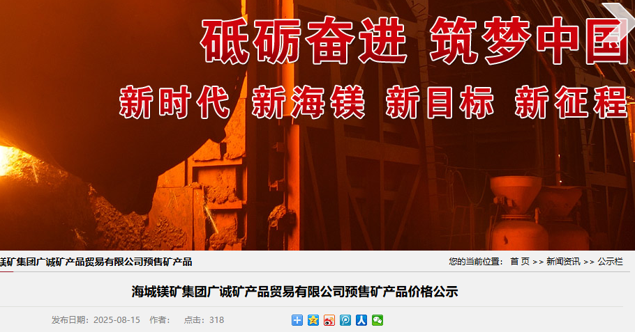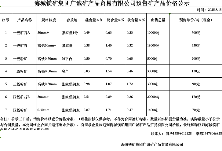 海城鎂礦集團廣誠礦產(chǎn)品貿(mào)易有限公司預(yù)售礦產(chǎn)品價格公示