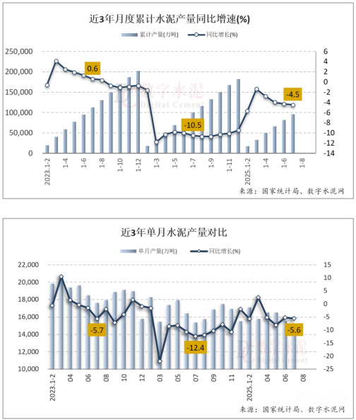 國(guó)家統(tǒng)計(jì)局?jǐn)?shù)據(jù)顯示,2025年1-7月,全國(guó)累計(jì)水泥產(chǎn)量9.58億噸,同比下降4.5%,降幅較1-6月擴(kuò)大0.2個(gè)百分點(diǎn),較去年同期收窄6個(gè)百分點(diǎn)。7月份,全國(guó)單月水泥產(chǎn)量1.46億噸,環(huán)比下降6.4%,同比下降5.6%。單月和累計(jì)產(chǎn)量均為2010年以來(lái)同期最低水平。