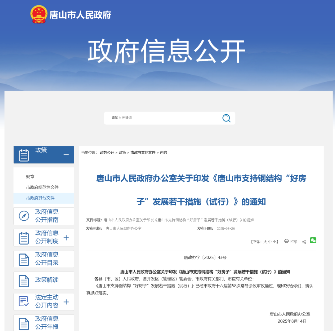 2025年8月20日,唐山市人民政府發(fā)布《唐山市支持鋼結構“好房子”發(fā)展若干措施(試行)》通知。